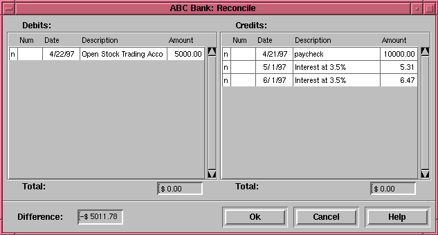 The Reconcile window is for reconciling the user's records at the end of the month when the bank statement comes. For example, if you write a check for something, enter the transaction. When you know that the check has cleared, you can click the field between the description and payment fields, and it changes from a 'n' to a 'c', indicating the transaction has cleared. At the end of the month, open the reconcile window, and xacc will prompt you to enter the ending balance from the bank statement. Then the reconcile window will pop-up, and you will see a credit and a debit column that lists all the non-reconciled transactions. You can then check off the transactions that appear in the bank statement, and verify the amount fields are correct. At the bottom of the window is a difference field, which should be $0.00 when you are done reconciling. If it isn't then you missed a transaction, or one of the amounts is wrong. When you press "Ok", then the 'n' or 'c' in the transactions that were checked off will change to a 'y'. When you change anything in a reconciled transaction, a verify dialog box should pop-up, but this doesn't seem to be happening anymore. Also, the "cleared" total at the bottom seems to display $0.00 regardless of what transactions are cleared or reconciled. The "cleared" total should display the total of only the transactions that have been cleared ('c') or reconciled ('y').